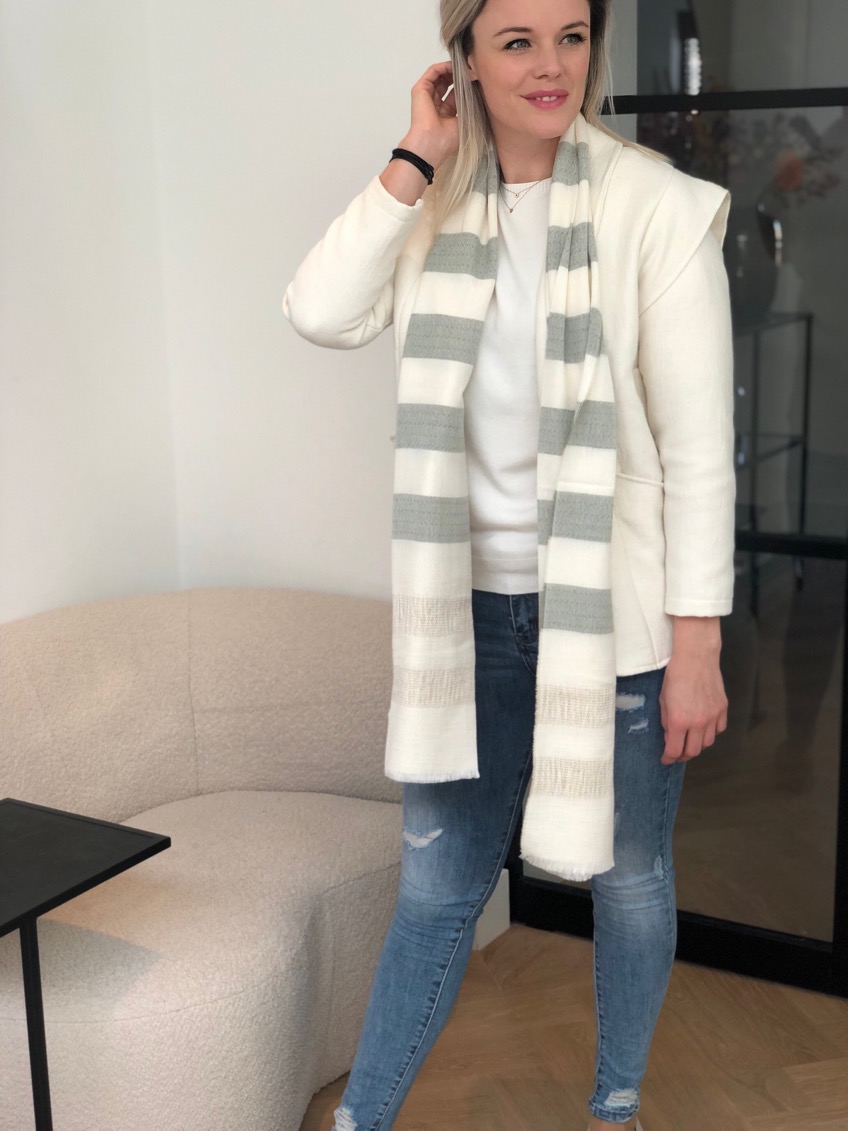 Gave gestreepte zomersjaal in ecru/zandkleur. Ook verkrijgbaar met mosgroen.
